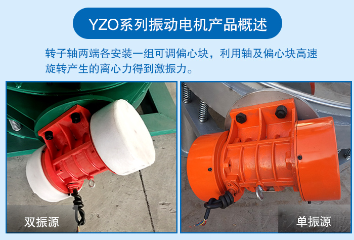 直排篩分機上專用YZO振動電機又叫做YZO臥式振動電機,其動力源與振動源結合為一體的激振源,臥式振動電機是在轉子軸兩端各安裝一組可調偏心塊,利用軸及偏心塊高速旋轉產生的離心力得到激振力。