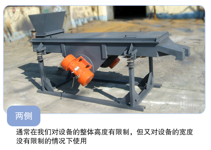 一、兩側:這種安裝方式也是直線振動篩設備振動電機較為采用的方法。通常在我們對設備的整體高度有限制,但又對設備的寬度沒有限制的情況下使用。比如因為一些物料的特殊要求,設備的出料口不能離地太高啦,在這種情況我們如果吧振動電機安裝在直線篩的底部或者頂部,那么設備的整體高度就不好控制了。一般來說直線篩的篩箱的高度通常是一定的,所以我們不能對篩箱的高度做調整,這是就可以考慮將振動電機安裝在直線篩的兩側,這樣可以大大的降低設備的整體高度,又不影響設備的工作效率。
