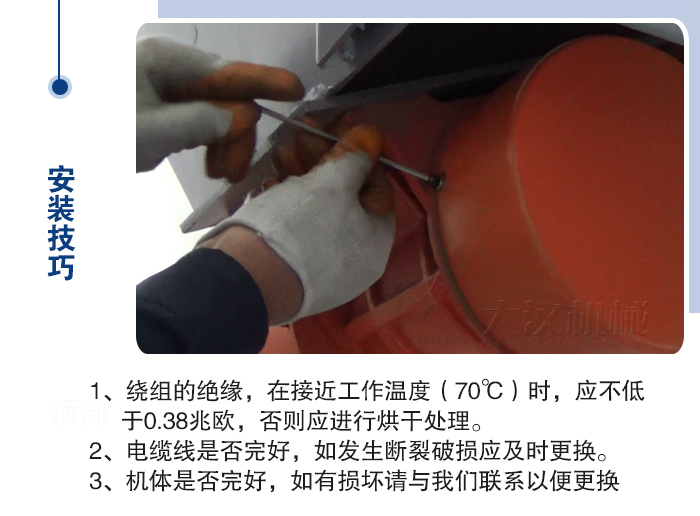 振動電機與振動機械連接平面粗糙度均應為3.2或更高。1、繞組的絕緣,如受潮應采用相應方法處理500V兆歐表檢查繞組的絕緣電阻,在接近工作溫度(70℃)時,應不低于0.38兆歐,否則應進行烘干處理。