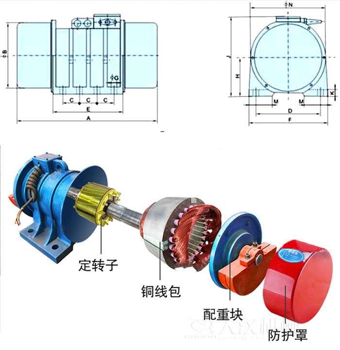 YZUL型立式振動電機是動力源與振動源結合為一體的激振源,振動電機是在轉子軸兩端各安裝一組可調偏心塊,利用軸及偏心塊高速旋轉產生的離心力得到激振力。由電機本身運行產生易于調整的水平、垂直、傾斜等方向多元激振力,形成物料的快速平面分散、中心聚集、平面旋轉、三維旋轉等多種運動方式,用于控制排料速度、處理精度等機械性能指標,以其獨特的結構特點適應于不同的機械對振動源的要求。