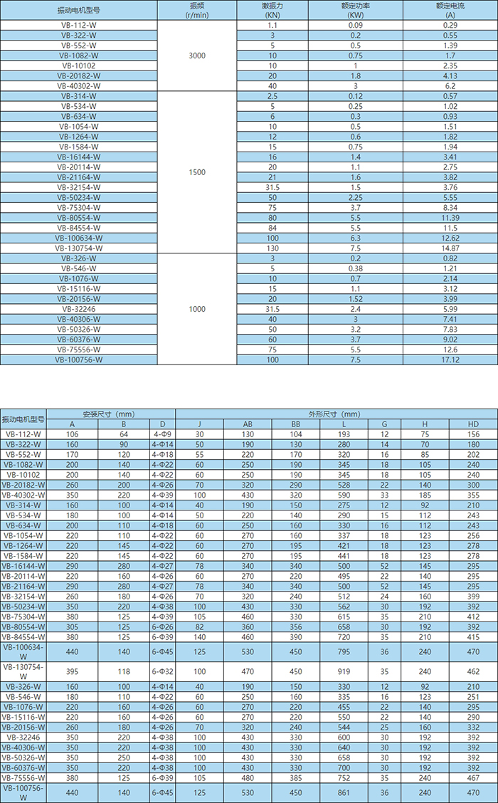 VB系列振動電機,功率范圍0.12~25KW,2、4、6、8極,激振力為2.5~300KN,共計五十余種規格型號。