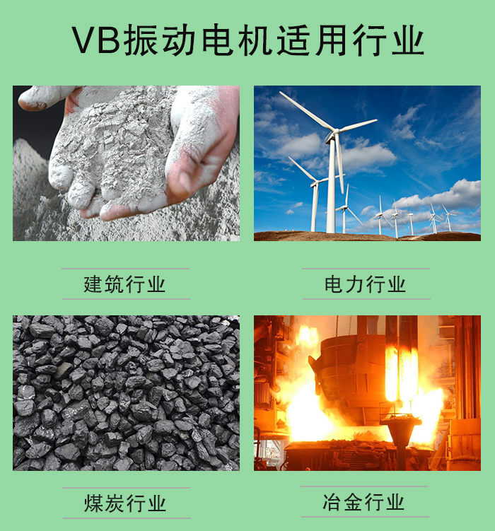 VB振動電機作為各類振動機械設備的振動源,如振動給料機、振動輸送機、振動放礦機、振動落砂機、振動篩分機、料倉振動防閉塞裝置等,廣泛適用于電力、建材、煤炭、礦山、冶金、化工、輕工、鑄造等行業。